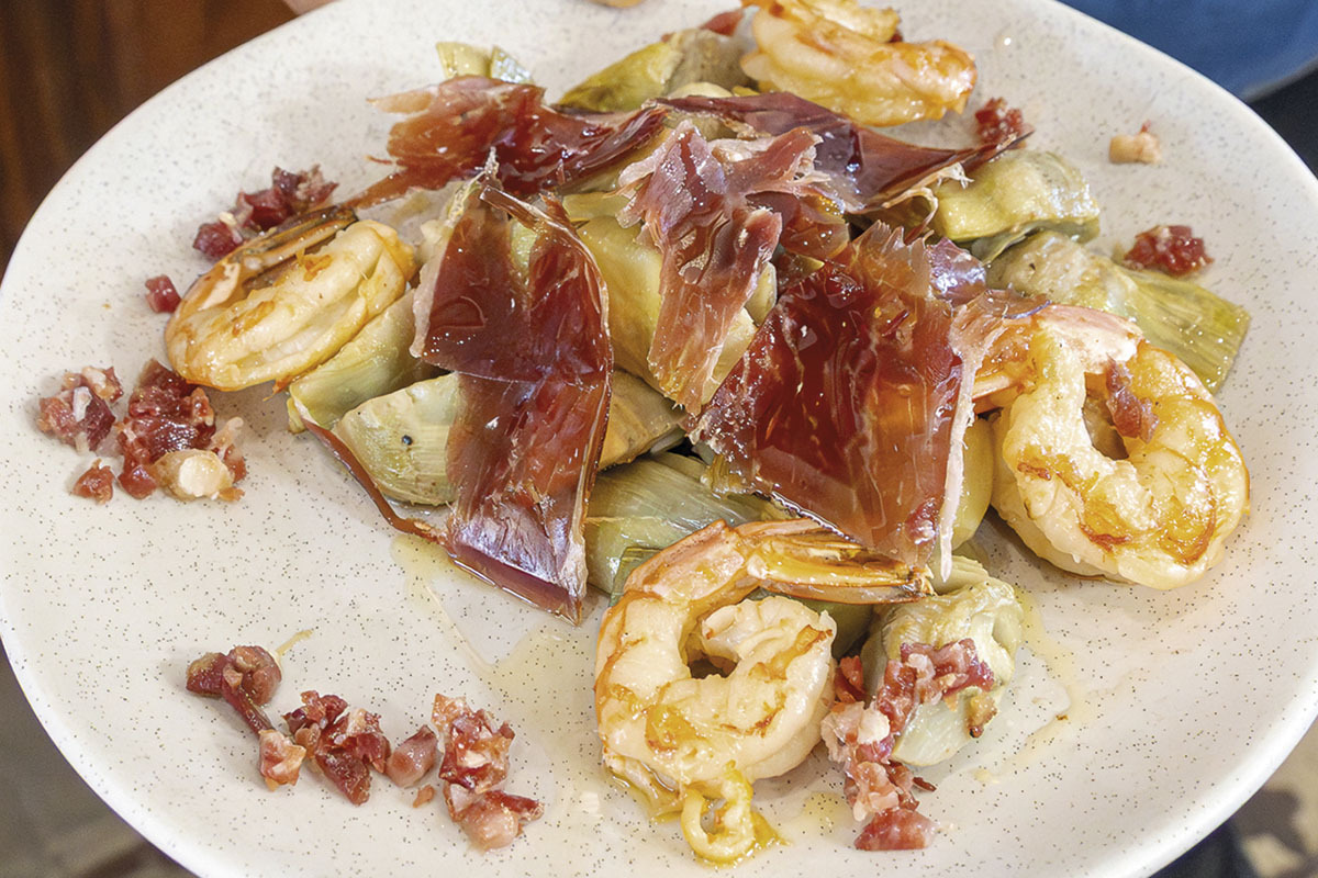 Alcachofas salteadas con jamón y gambas en Casa Patacona