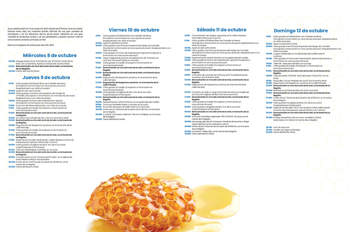 Un año más y con este serán veinticuatro, la localidad de Ayora se prepara para celebrar «El Primer Corte de la Miel», un evento apícola, gastronómico, turístico y cultural, que tiene como hilo conductor la miel, producto por excelencia de la población, muy valorado por su calidad.