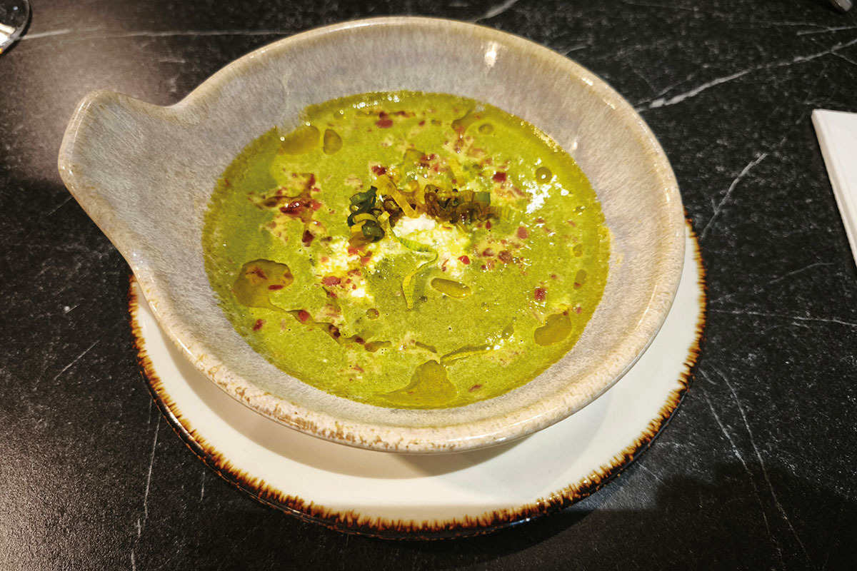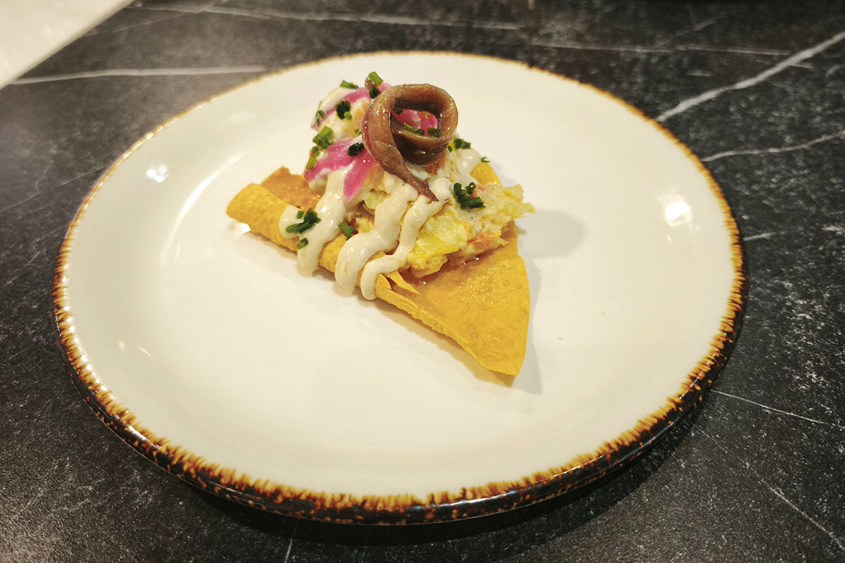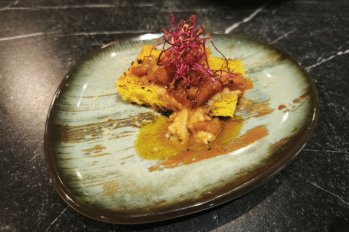 Un ejemplo es la propuesta que les mostramos, compuesto por una trilogia de entrantes consistentes en una ligera crema de espinacas con polvos de jamón y un toque de queso de cabra; una edificante ensaladilla rusa con cebolla encurtida y anchoa sobre papadum; y un brioche con manzana caramelizada y foie. Hattrick de delicioso sabor. En el apartado de arroz o fideuà, la propuesta alternaba entre el pato con setas y foie, la gamba roja y uno de los grandes clásicos de la casa: arroz de secreto, alcachofa de temporada, blanquet y tuétano. De recuerdo imborrable en el paladar. Como broche, de entre el abanico de creaciones caseras, podemos hablar del cremoso tiramisú de pistacho y del goloso lemon pie.