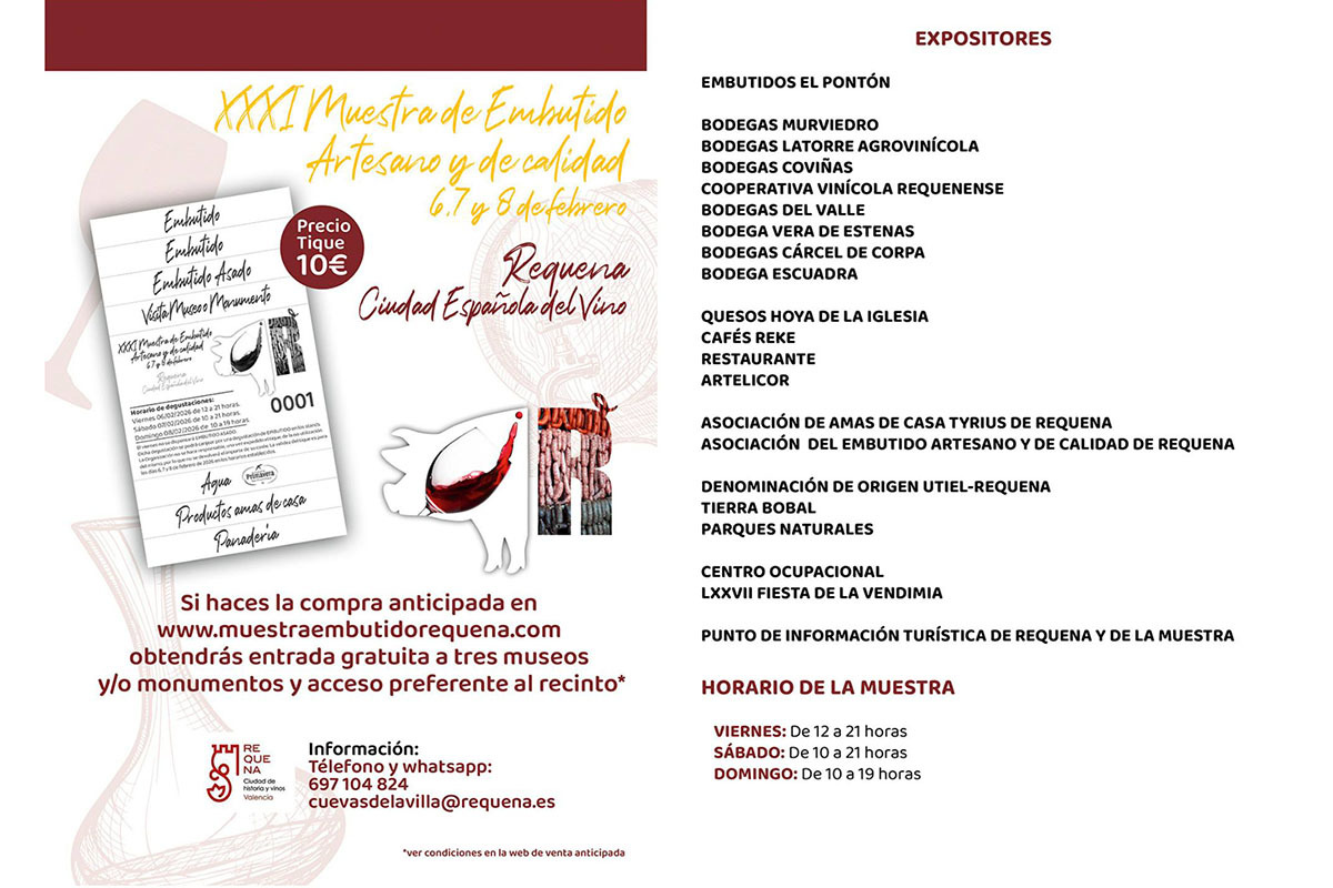 Junto a la Muestra de Embutido, la Ciudad Española del Vino 2026, contará con expositores de Bodegas Murviedro, Bodegas Latorre, Bodegas Coviñas, Cooperativa Vinícola Requenense, Bodegas del Valle, Bodega Vera de Estenas, Bodegas Cárcel de Corpa y Bodega Escuadra.