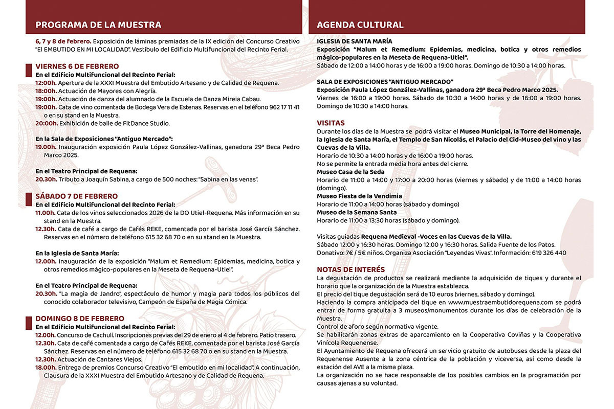 Durante todo el fin de semana, el recinto ferial de Requena, volverá a convertirse en punto de encuentro para vecinas, vecinos y visitantes, con una programación centrada en la promoción del embutido tradicional, el producto local y la gastronomía de calidad, así como en actividades culturales y de ocio para todos los públicos.