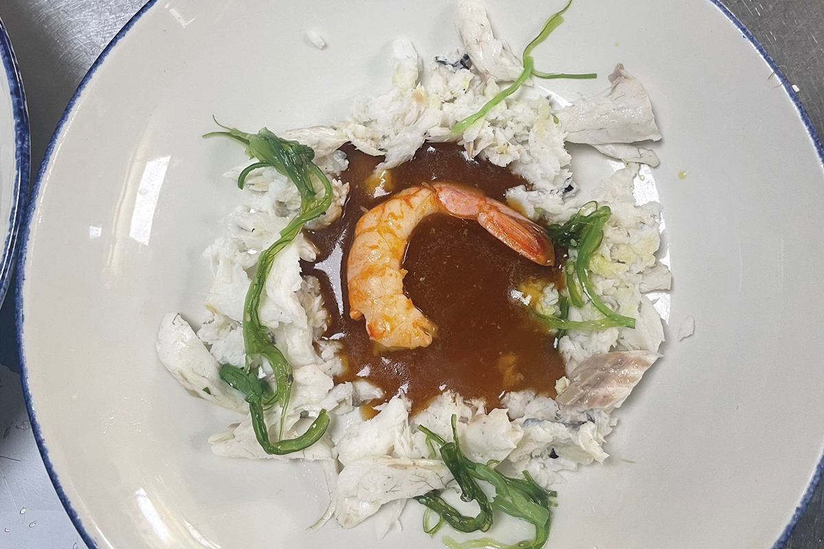 Ensaladilla rusa con quisquilla confitada, huevas de tobiko y polvo de aceituna en La Romana