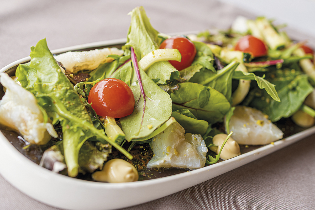 En el paraje natural de L’Estany de Cullera se encuentra Casa Salvador, uno de los grandes templos de la cocina mediterránea en la Comunidad Valenciana. Su carta, amplia y variada, es un homenaje al producto local, con el arroz como protagonista indiscutible, motivo por el que se la conoce como la “Catedral del Arroz”. En esta ocasión presentan una ensalada fresca y muy cuidada: brotes verdes con tomatitos cherry, bacalao previamente marinado con lima y pimienta, tiras de calabacín, marinadas con sal, aceite de oliva y pimienta, pistachos triturados y una mayonesa de cítricos. Todo se corona con aceite de oliva y sal.