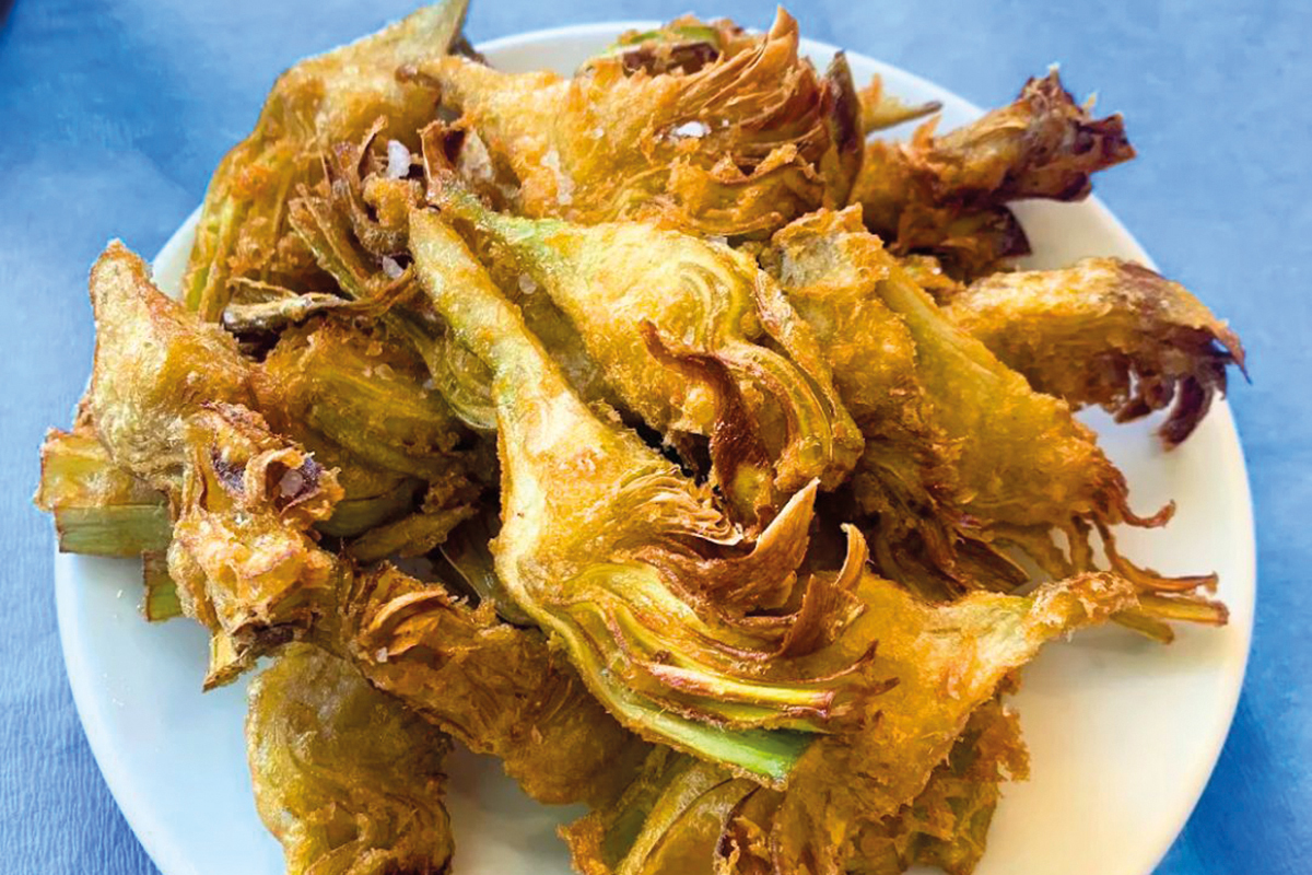 Alcachofas salteadas con jamón y gambas en Casa Patacona